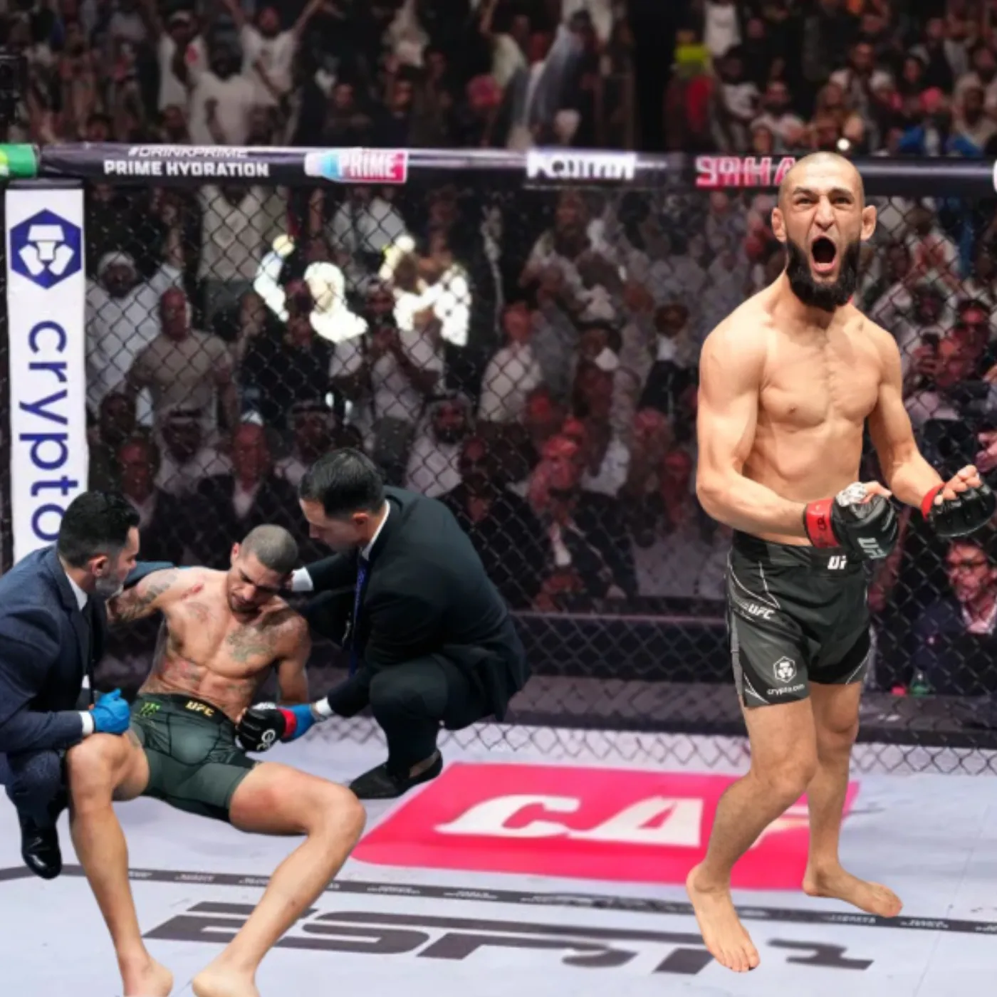 Silence followed the stoppage, broken only by scattered cheers that quickly grew into a thunderous reaction. Fans struggled to process what they had just witnessed. Alex Pereira, a fighter synonymous with resilience and composure, had been stopped in a manner few believed possible. Khamzat Chimaev stood victorious, his expression intense but controlled.