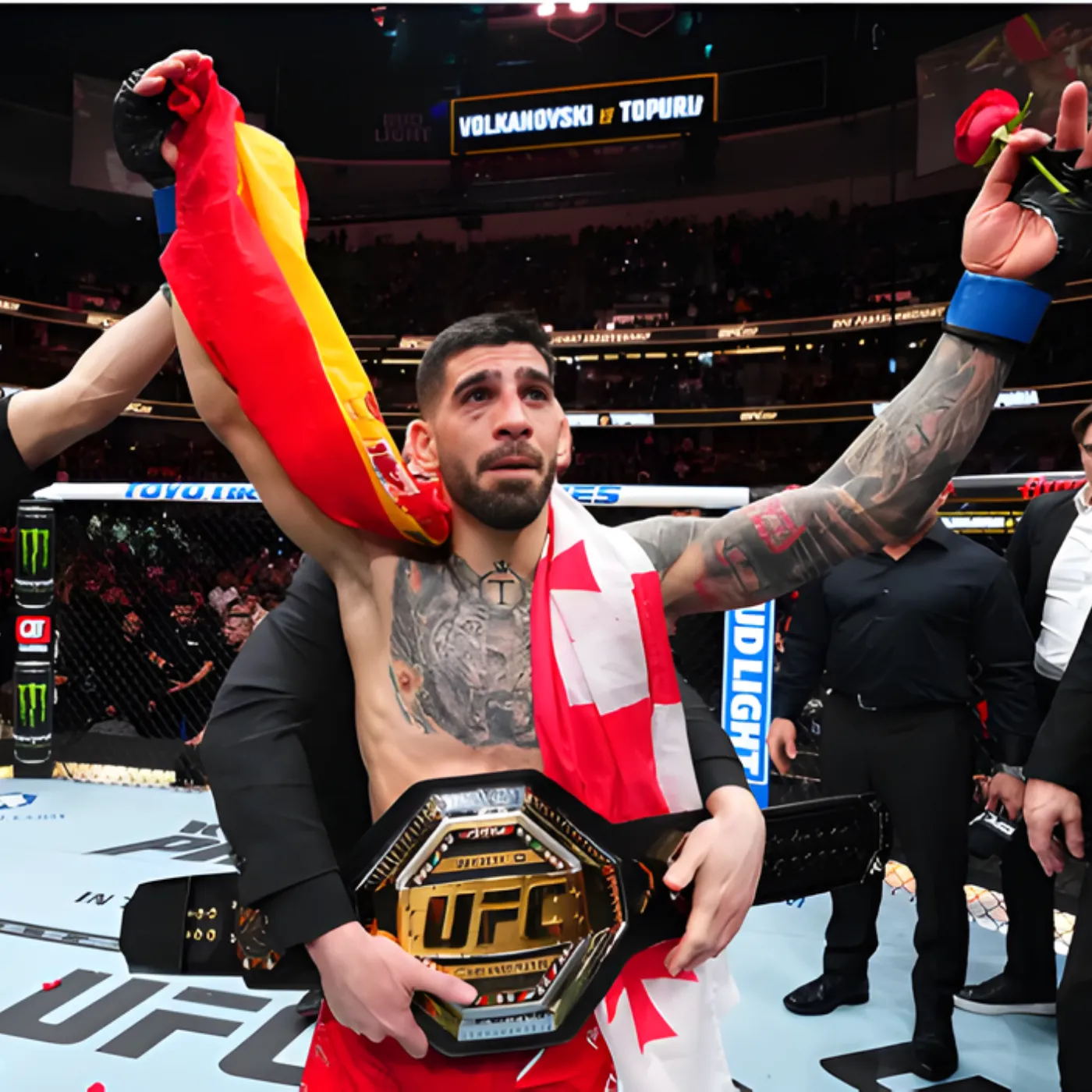 Across from him stood Ilia Topuria, the fearless striker who embraced chaos, believed in destiny, and saw no reason to bow to legacy. He had built his rise on precision, power, and a brand of confidence that bordered on prophetic. Topuria was not fighting for validation. He was fighting to prove that he was not just the future of the sport, but its new standard.