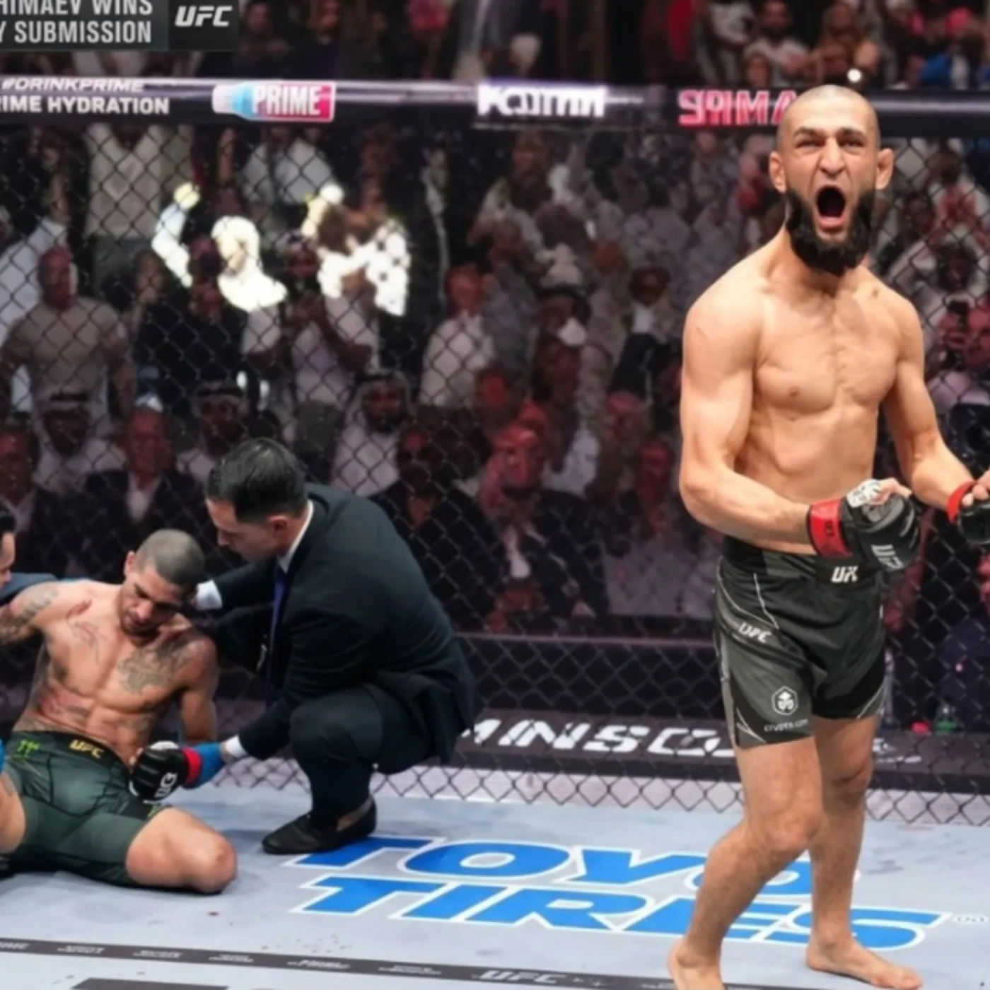 Pereira lay motionless on the canvas, the reality of what had just happened taking a moment to fully register. Chimaev stood nearby, his expression a mix of intensity and realization, knowing he had just delivered a moment that would be remembered for years.