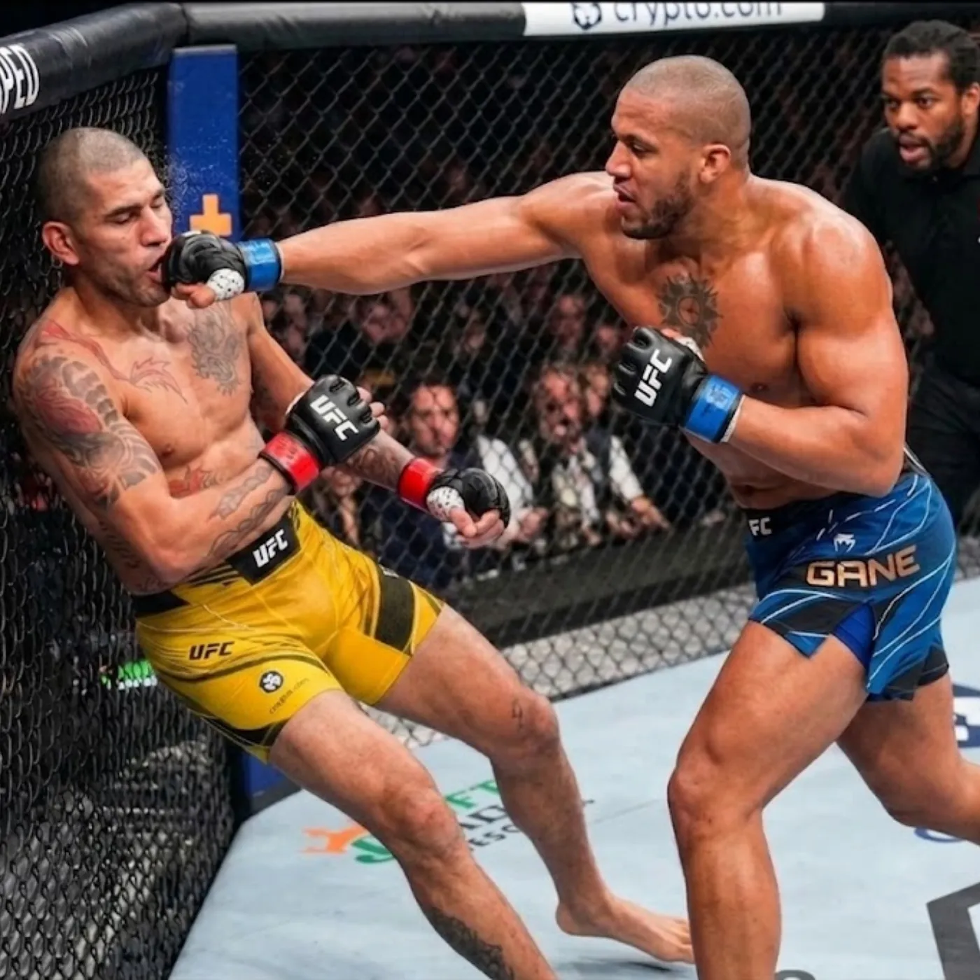 The fight erupted faster than anyone anticipated. Within the first minute, both men had already landed significant strikes, each testing the other’s resilience. Gane’s movement was immediately noticeable, his ability to slip just out of range creating frustration for Pereira. But Pereira’s pressure never wavered. He stalked forward, cutting off angles, forcing Gane into tighter spaces.