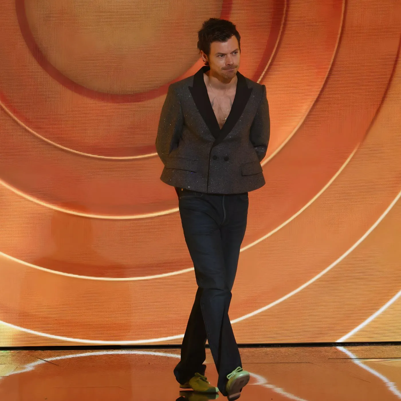 On-set photos from the Grammys production team show Styles rehearsing in the outfit, adjusting the fit for comfort during performances. His setlist included hits like “As It Was” and “Watermelon Sugar,” where the blazer added a visual flair to his energetic dance moves. This preparation underscores the meticulous planning behind Styles’ public persona.
