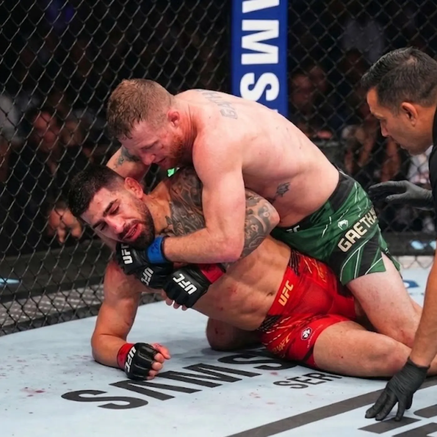 Topuria, still confident, continued to push forward. He saw the same openings he had exploited in the first minute, but he did not yet realize that those openings were no longer what they seemed. Gaethje had begun to anticipate rather than react.