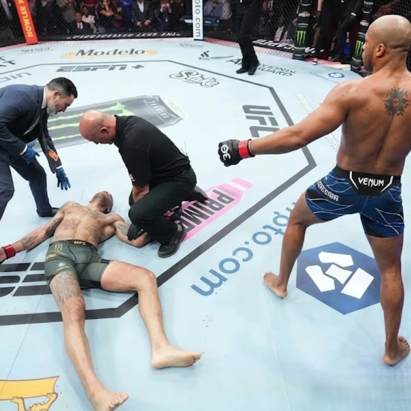 A perfectly timed strike that connected with undeniable force. Pereira’s body reacted instantly, collapsing under the sheer impact. The referee stepped in without hesitation, waving off the fight as the arena exploded into chaos.