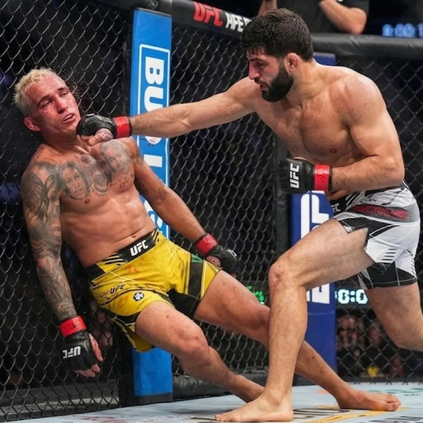 As the fight progressed into the later stages of the first round, the tempo began to change. Tsarukyan started to close the distance more aggressively, blending his striking with feints that kept Oliveira guessing. It was here that the first cracks began to appear. A well-timed combination from Tsarukyan forced Oliveira to retreat momentarily, a rare sight that did not go unnoticed.