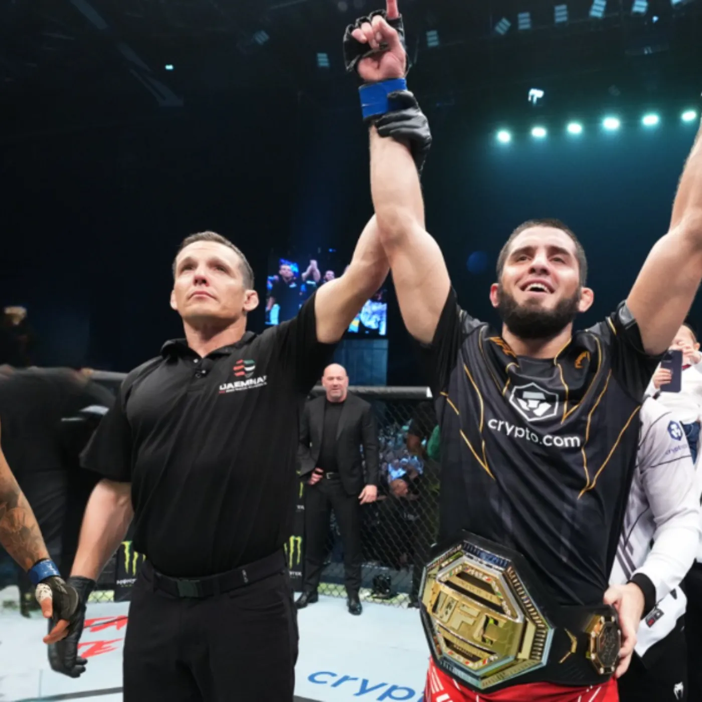 Entering the later rounds, the arena sensed the shift. The energy had changed. The cheers grew cautious, the tension heavier. Islam Makhachev looked as composed as he did in the opening minute. Ilia Topuria, despite his resilience, carried the marks of attrition.