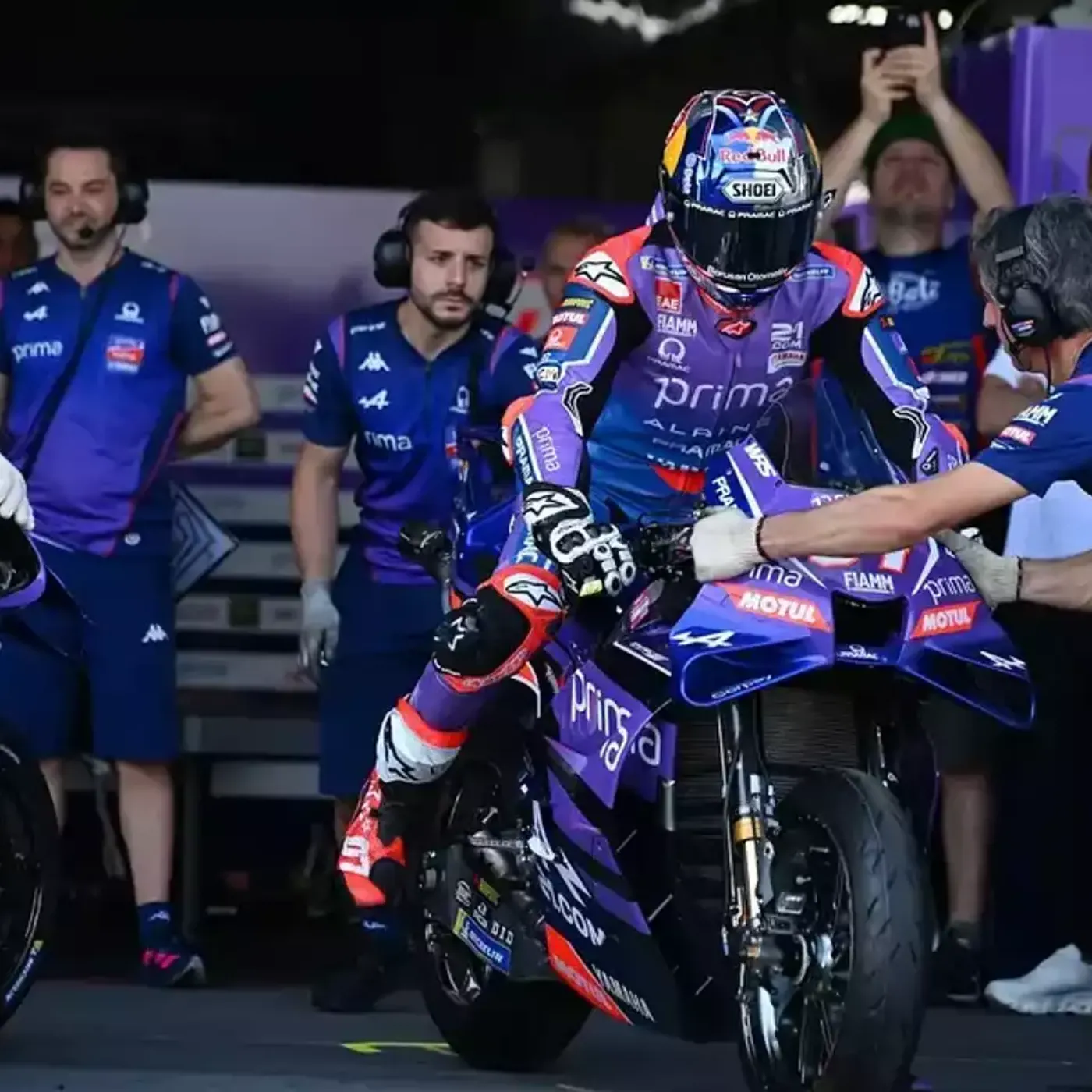 There were moments when the garage remained unusually calm, even as rival teams continued sending their riders onto the circuit. Mechanics worked quietly around the bike, sometimes making adjustments that appeared minor from the outside yet required extended preparation.