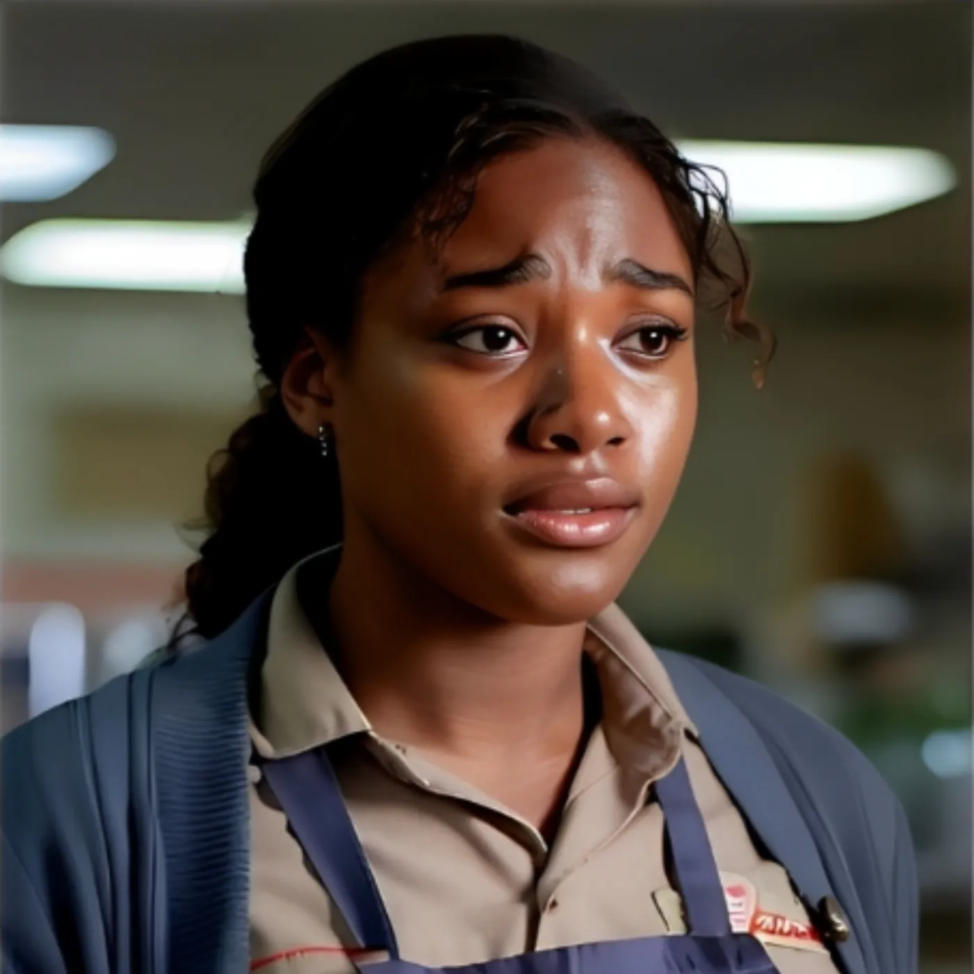 She looked up, startled, as if pulled back into the world after being lost in her thoughts. For a moment, she said nothing. Then her eyes filled with tears she clearly hadn’t planned to show. She shook her head slightly, a silent admission that she was not okay at all.