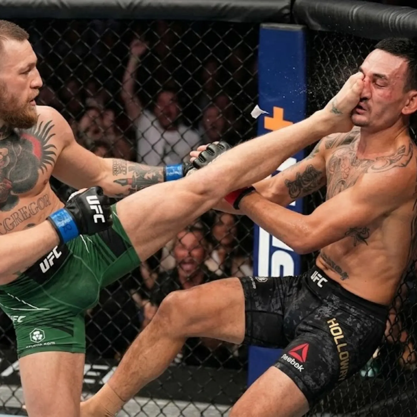 Within seconds, McGregor closed the distance with surgical precision. His eyes locked onto his target, every movement deliberate, every step measured. Then came the first significant strike, a lightning-fast left hand that snapped Holloway’s head back and sent a shockwave through the arena.