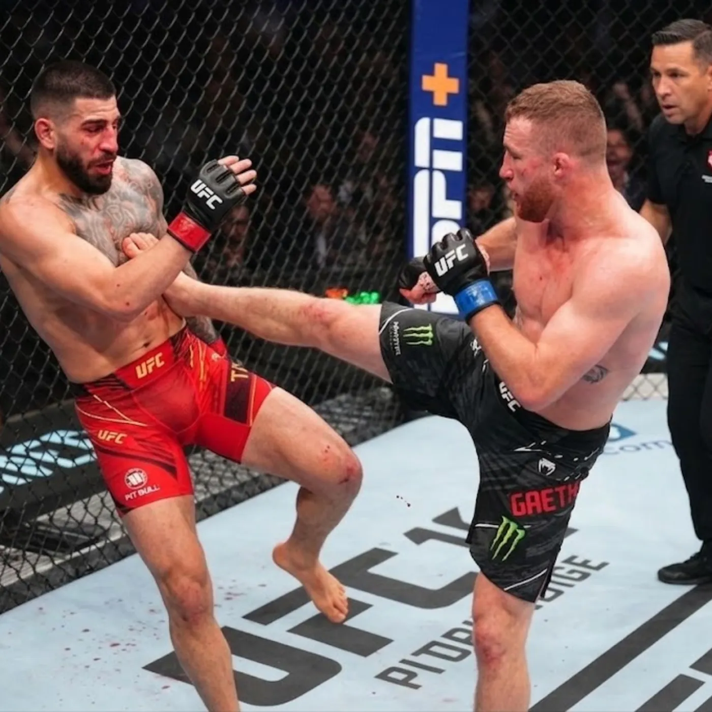 From the opening seconds, it was clear that this fight would not follow a predictable script. Topuria moved with his usual confidence, establishing range and testing Gaethje’s reactions with sharp, measured strikes. His footwork was precise, his timing impeccable. For a moment, it seemed as though the narrative would unfold as expected.