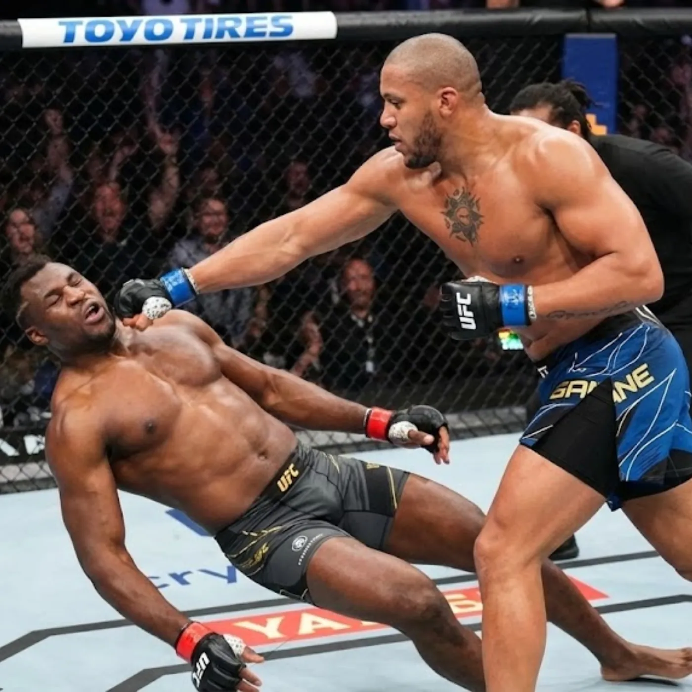 The decisive moment arrived in a blur of motion. Gane slipped a wide punch and delivered a perfectly timed strike that landed flush. The impact echoed through the arena. Francis Ngannou, the symbol of destruction, stumbled. Before he could recover, Gane followed with ruthless precision. The sequence was not reckless. It was calculated, composed, and devastating.