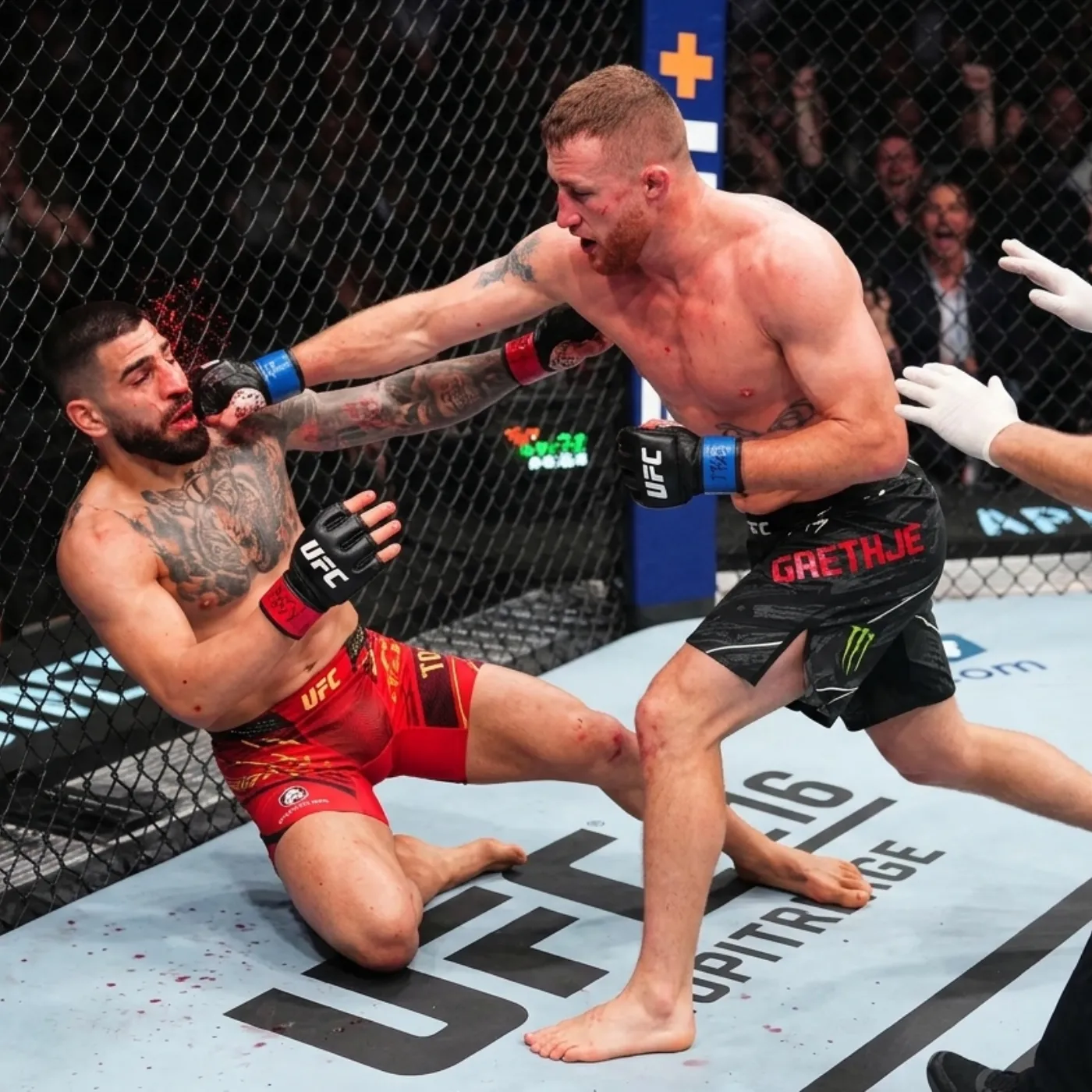 The energy inside the arena reached an almost unbearable intensity long before the cage door closed. Fans from all corners of the world had gathered to witness what was expected to be a technical war between two of the most dangerous fighters in the sport. On one side stood Justin Gaethje, a man whose reputation for chaos, pressure, and raw brutality had earned him legendary status. On the other side stood Ilia Topuria, an undefeated force rising rapidly through the ranks with precision, confidence, and a seemingly unshakable composure.