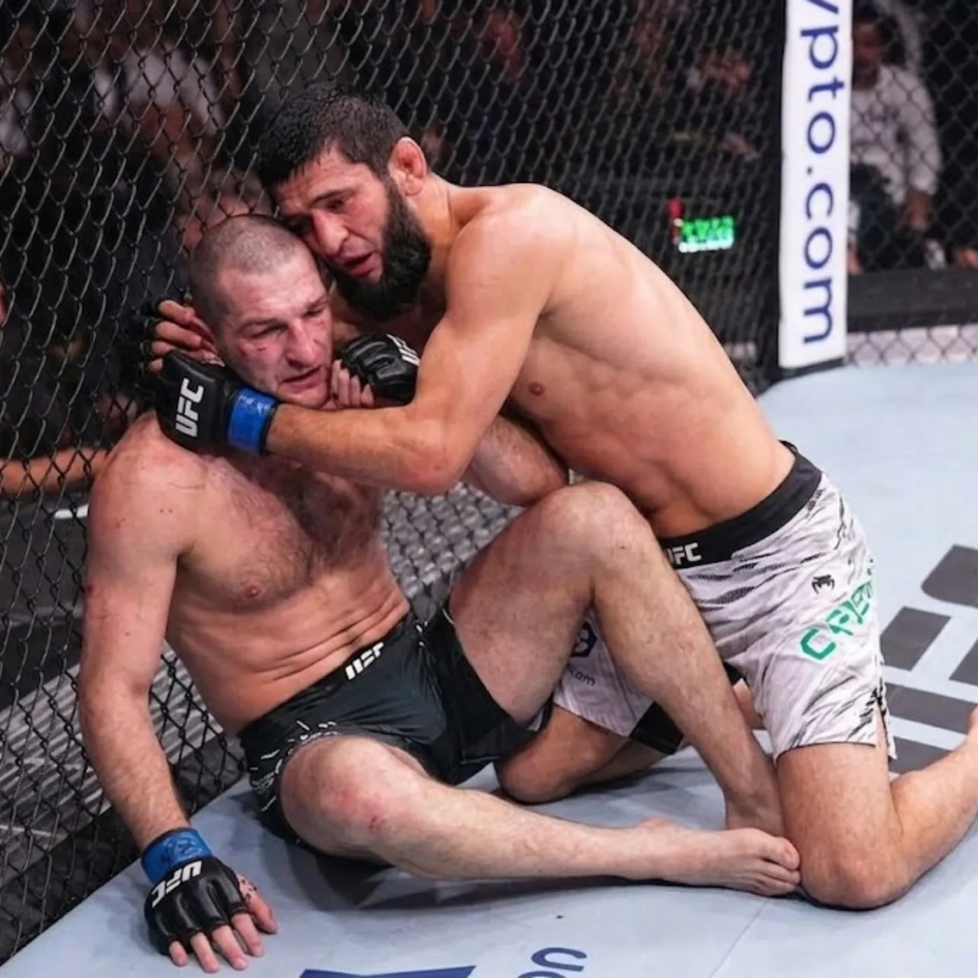 Midway through the round, Chimaev secured a decisive takedown. This moment marked a turning point. Once on the ground, his control was suffocating. He applied heavy top pressure, limiting Strickland’s mobility and forcing him into defensive reactions.