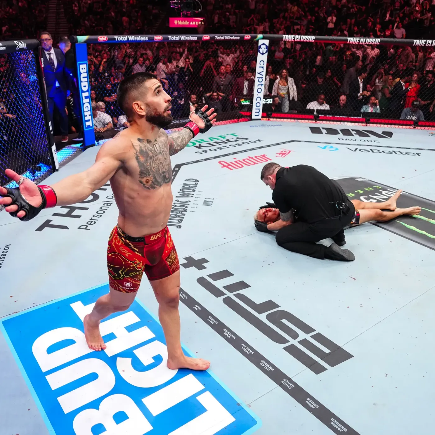 Moments later, another perfectly placed shot landed with decisive force. The impact echoed through the arena, followed by the unmistakable reaction of a fighter whose balance had been compromised. When Gaethje fell to the canvas, Topuria did not rush recklessly. He advanced with the calm certainty of someone who understood the moment completely. Seconds later, the referee stepped in, sealing one of the most dramatic finishes the division has witnessed in recent memory.