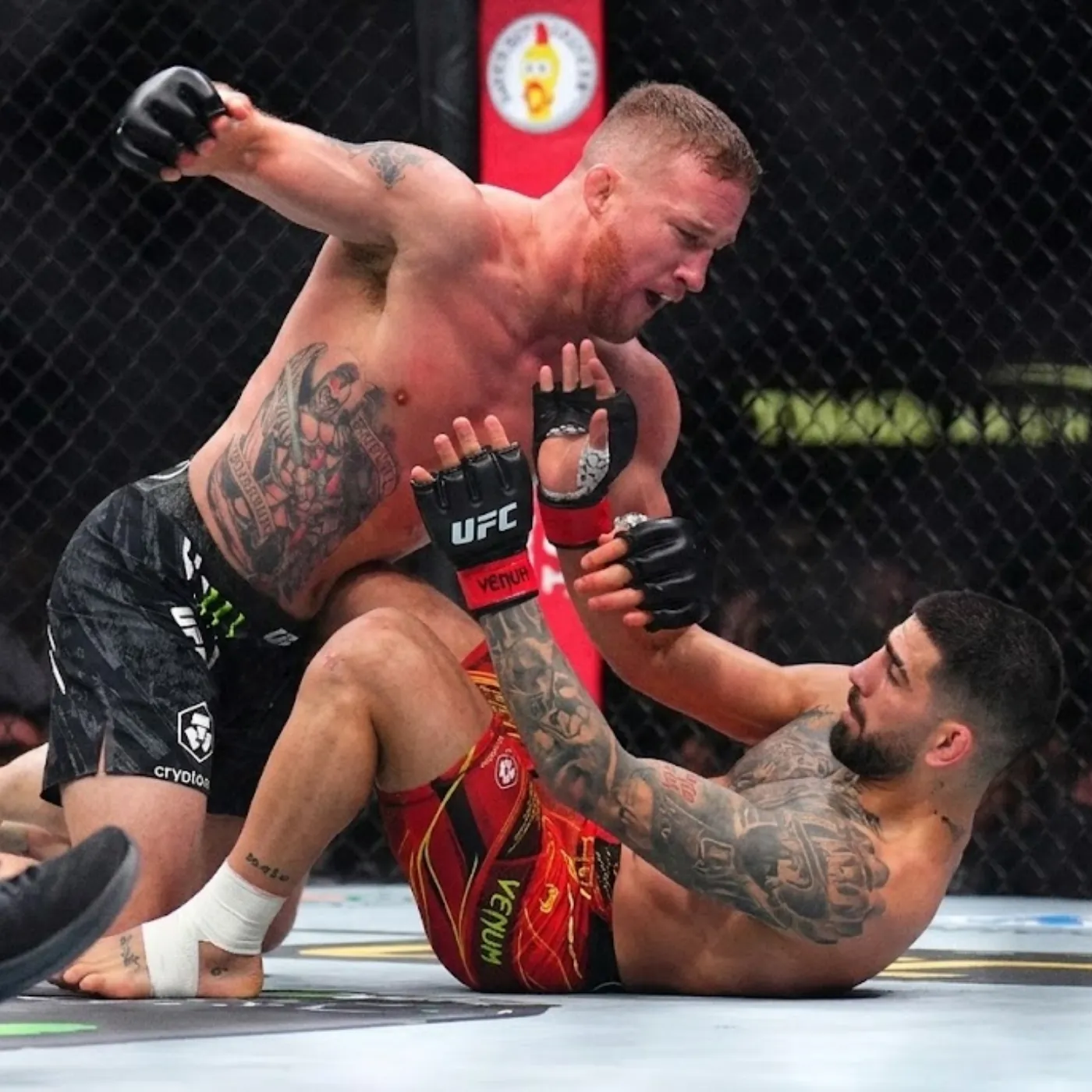 Justin Gaethje begins moving forward with his familiar intensity, eyes locked on his opponent. Across the cage, Ilia Topuria watches carefully, measuring distance and waiting for the perfect moment.