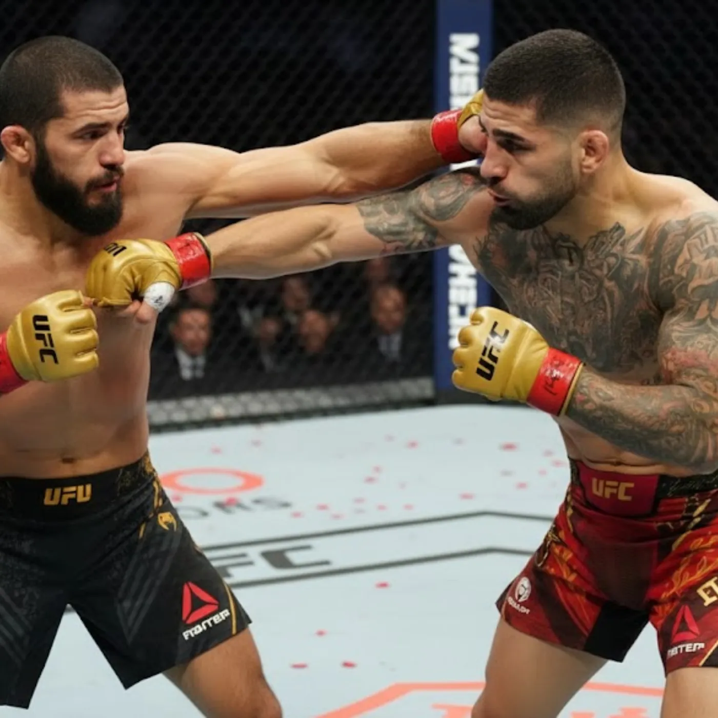 When the fight began, the first moments were defined by caution and calculation. Topuria tested distance with sharp movements, looking to establish his rhythm early. His stance was coiled and ready, eyes locked on the target in front of him. He understood the importance of seizing initiative against a champion known for dictating pace.