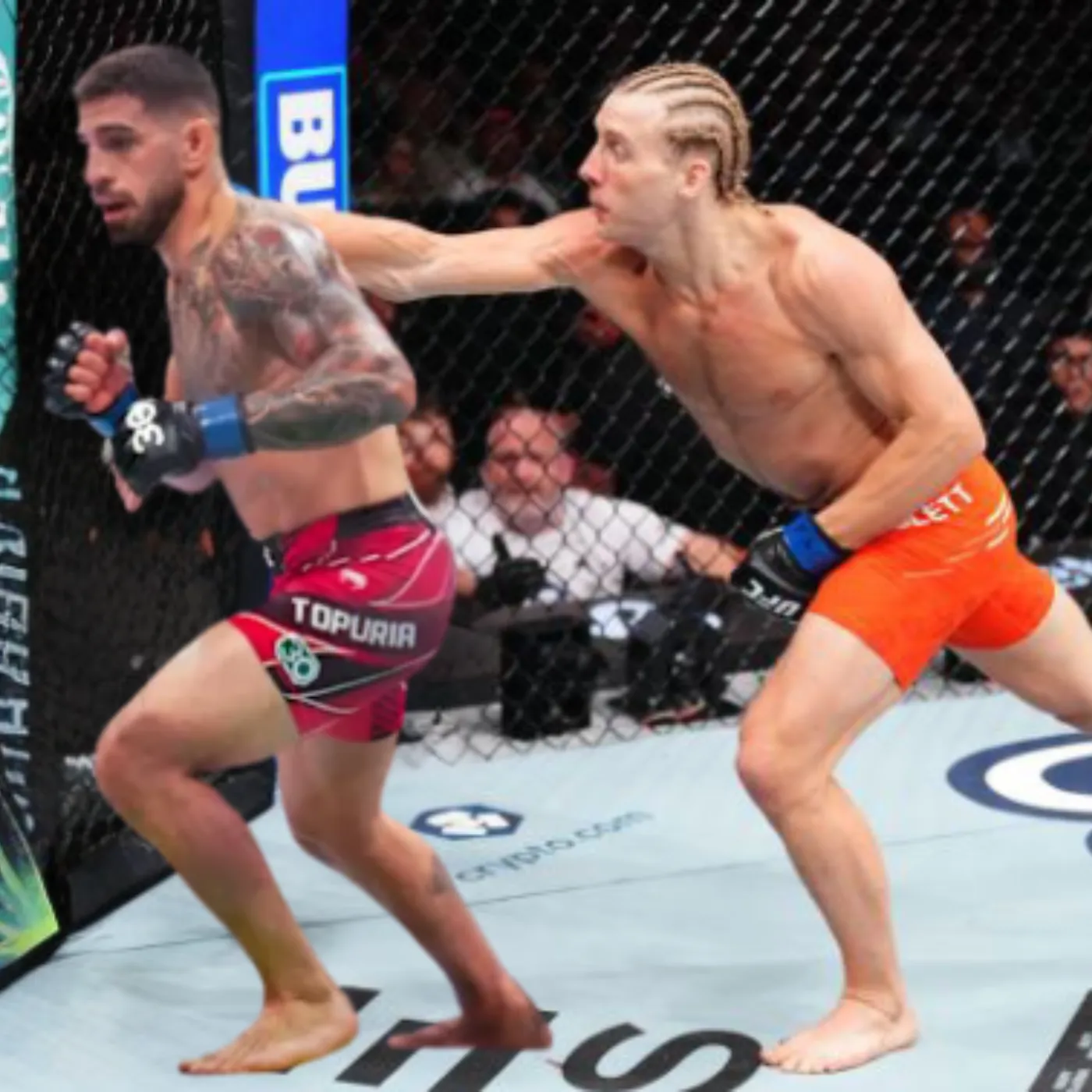 From the very first second, the arena shook. Topuria charged forward, throwing blistering combinations aimed at Pimblett’s chin, trying to end the fight before it began. The crowd roared as Pimblett weathered the storm, slipping punches by inches and returning fire with his signature looping hooks. Every exchange was an explosion — fists cutting through the air, feet scraping across the canvas, and neither man willing to give an inch.