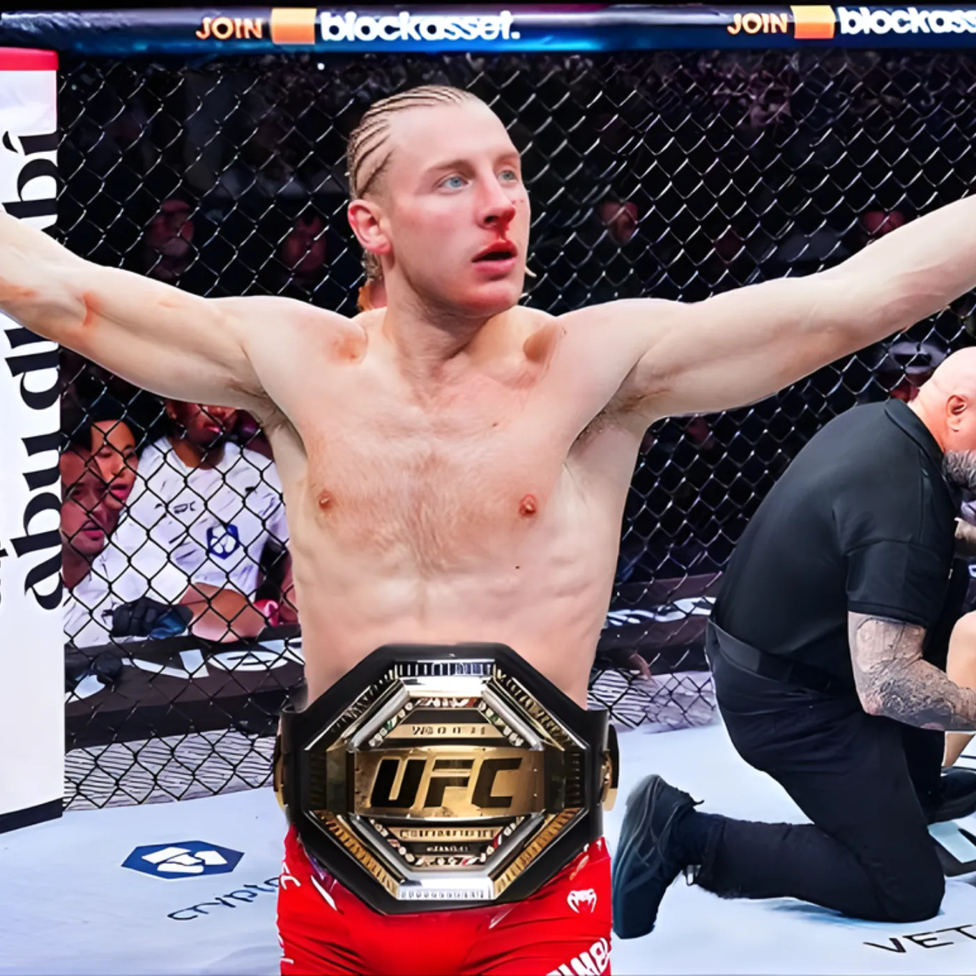 From the bell, Paddy Pimblett showcased why he is regarded as one of the sport’s most thrilling talents. His movement was fluid, almost poetic, yet every feint, jab, and kick carried lethal intent. Unlike many fighters who rely purely on brute strength, Pimblett’s timing and unpredictability gave him a distinct edge over Topuria. The contrast between Topuria’s composed, undefeated demeanor and Pimblett’s relentless aggression created a spectacle that had the crowd erupting with every exchange.