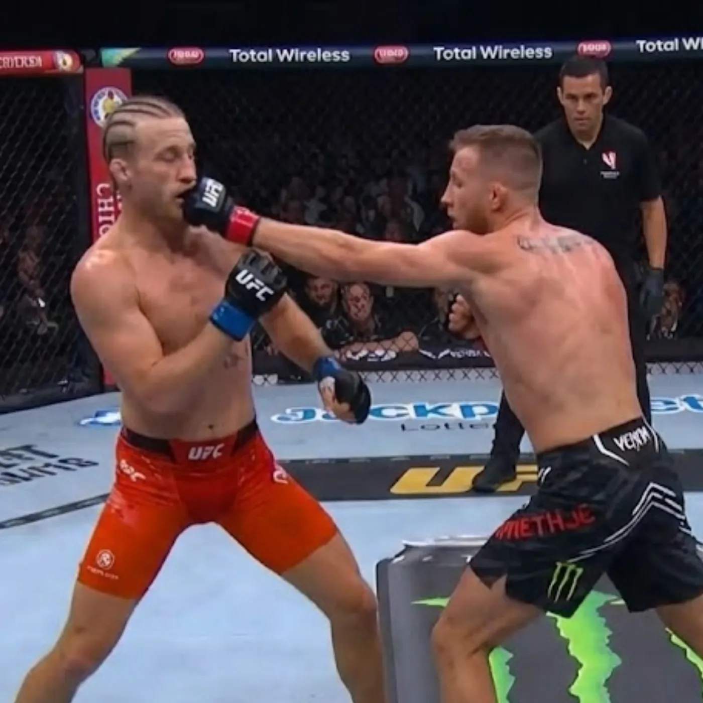 The first exchanges were cautious but telling. Justin Gaethje did not rush. He circled, measured distance, and tested reactions. Paddy Pimblett responded with movement and quick strikes, attempting to establish rhythm and confidence.