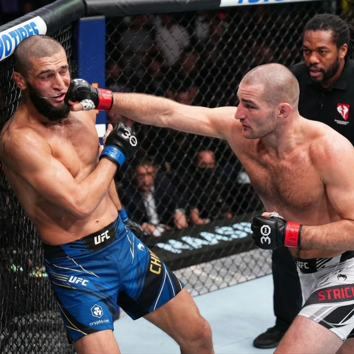 Strickland capitalized immediately. His jab began to find its mark more consistently, snapping Chimaev’s head back and forcing him to reconsider his approach. The crowd, sensing the shift, grew louder with each clean strike. What had started as a showcase for Chimaev’s dominance was quickly becoming a demonstration of Strickland’s resilience.