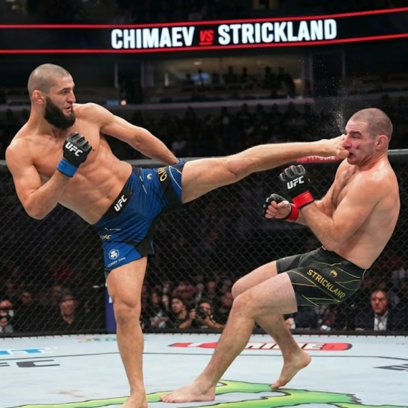 Within seconds, Chimaev closed the distance with startling speed. The aggression was not reckless; it was calculated, precise, and suffocating. He cut off angles, denied space, and forced Strickland into a reactive posture. The shift in momentum was immediate and unmistakable.