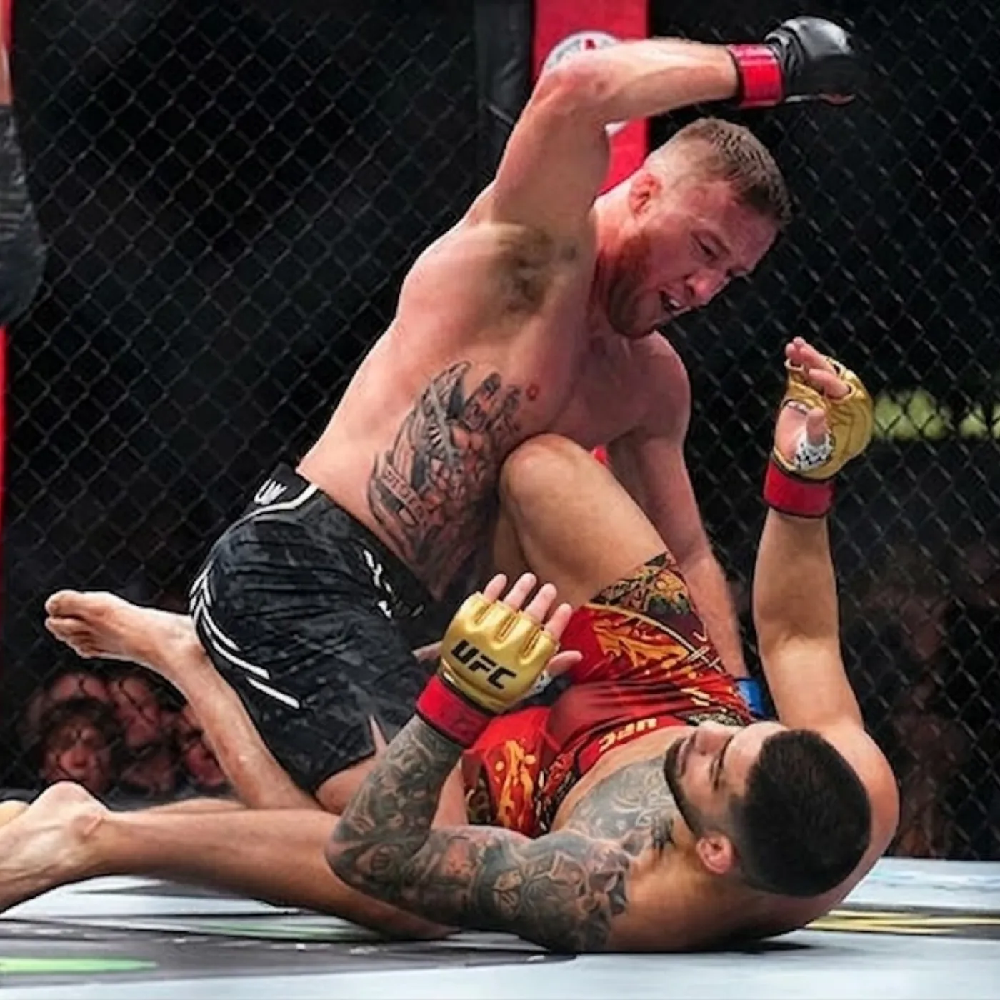 Gaethje’s pressure became relentless. He cut off the cage with increasing efficiency, forcing Topuria into tighter spaces. The strikes grew heavier, the exchanges more dangerous. Every moment felt like it could be the last.