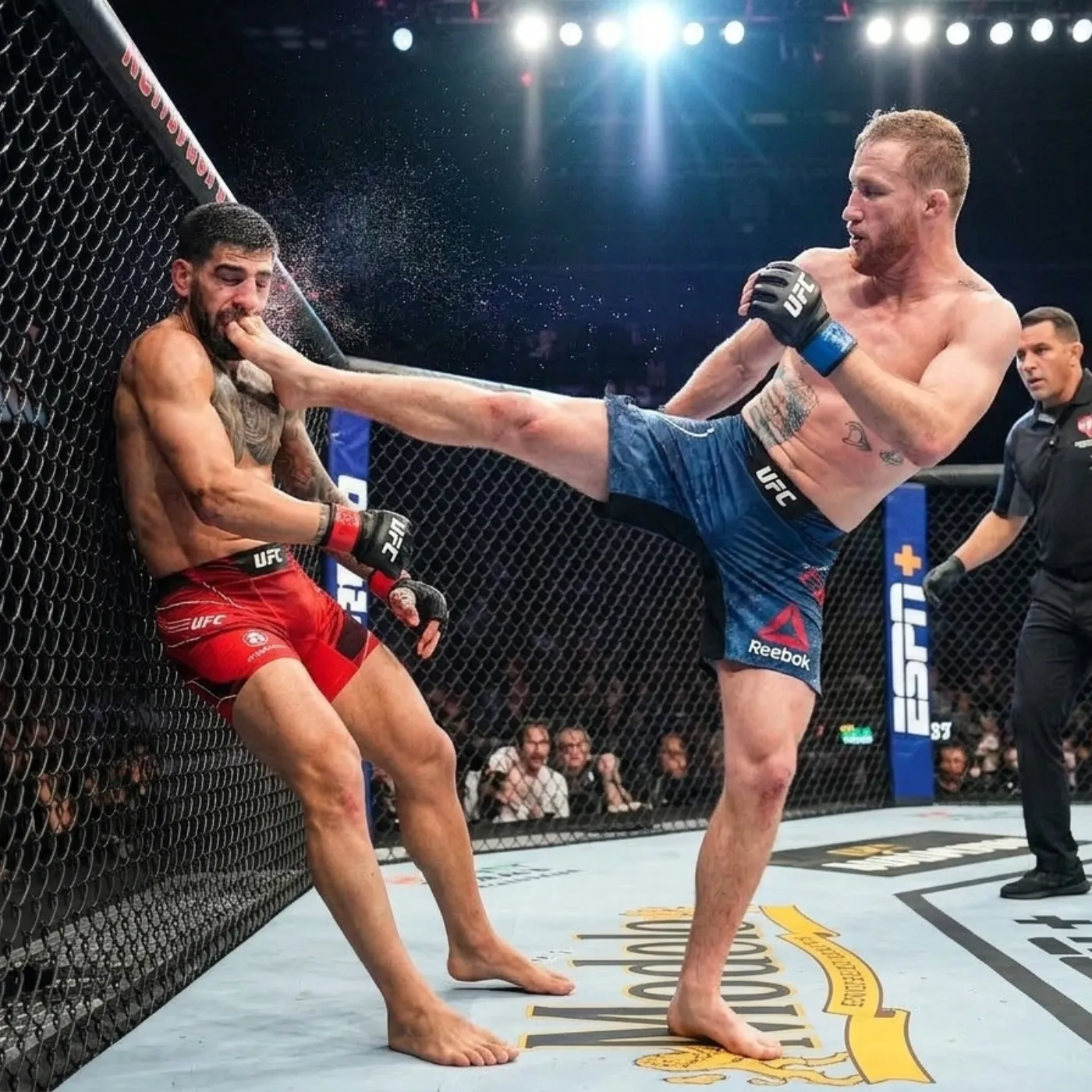 Then came the moment that would define the night. A perfectly timed combination from Justin Gaethje, delivered with explosive force, shattered the illusion of Topuria’s invincibility. The impact was immediate and devastating. Topuria, known for his composure, suddenly found himself in unfamiliar territory. The precision that had once been his greatest weapon now seemed overshadowed by Gaethje’s raw aggression.