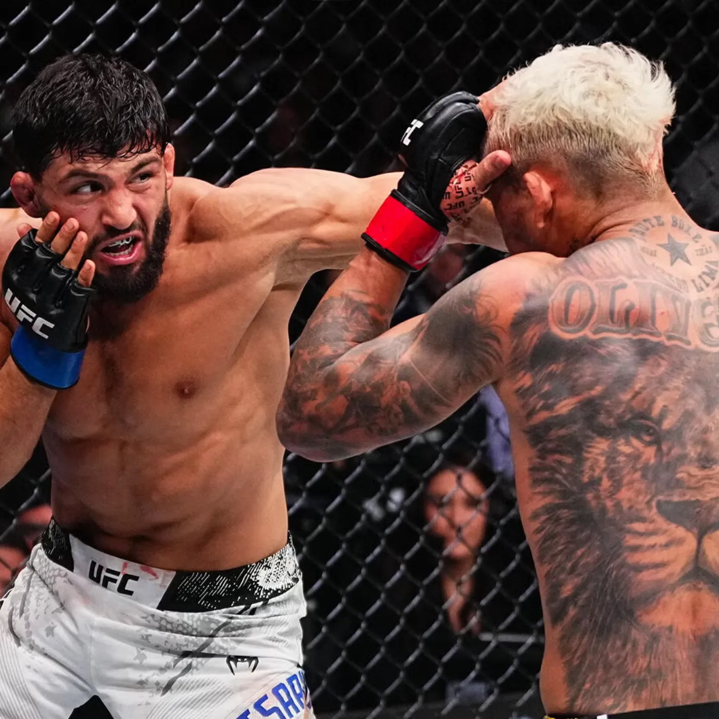 The pace intensified rapidly. Within seconds, the fight had escalated into a high-stakes exchange where every movement carried consequences. Oliveira attempted to counter, to find his rhythm, to impose his own threat. Yet each attempt was met with precision, speed, and an almost unsettling calm from Tsarukyan.
