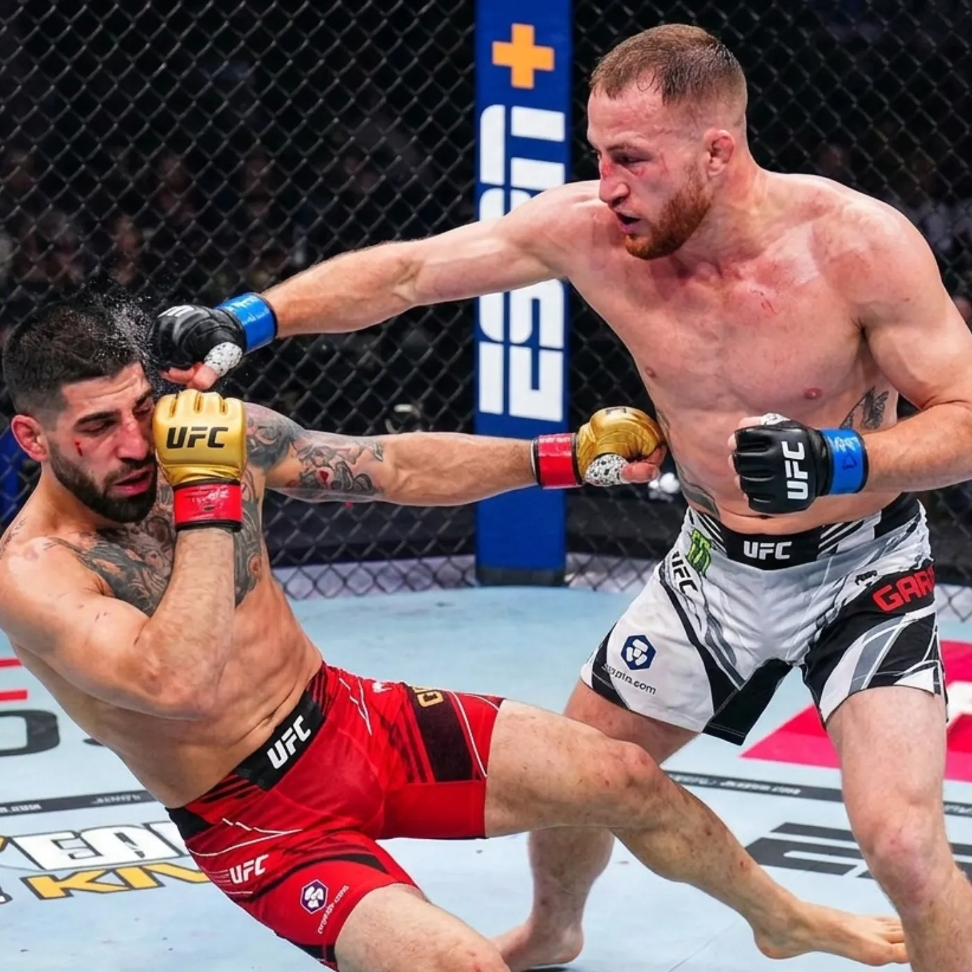 The atmosphere inside the arena was electric long before the first punch was thrown. Fans from every corner of the world had gathered to witness what many believed would be a defining moment in the lightweight division. On one side stood Justin Gaethje, a battle-hardened veteran known for his relentless aggression and unmatched durability. On the other stood Ilia Topuria, the rising star whose undefeated streak had sparked conversations about a new era in the sport. What unfolded, however, was not a passing of the torch. It was a reminder that experience, pressure, and controlled violence still reign supreme at the highest level.