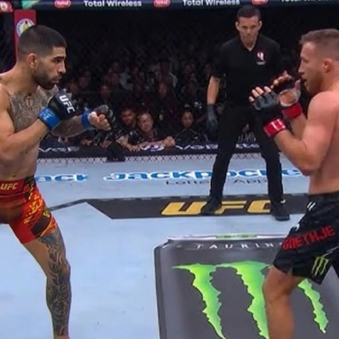 From the opening seconds, the pace was astonishing. Gaethje surged forward, immediately applying pressure that forced Topuria to respond. The early exchanges were sharp and explosive, each fighter testing the other with quick combinations and probing strikes.