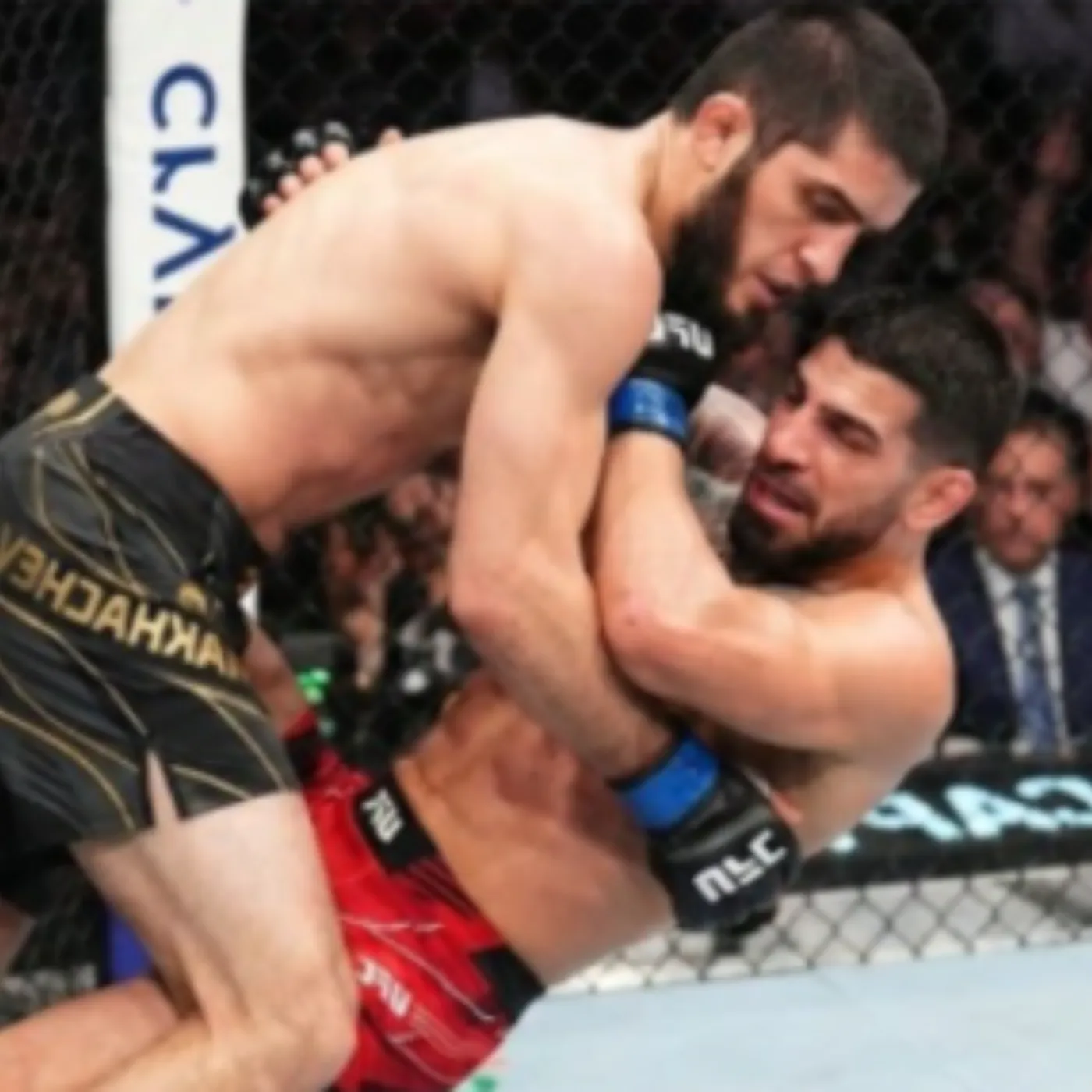 Once the takedown was secured, the emotional temperature inside the arena shifted instantly. Spectators understood the significance of the moment. On the canvas, Makhachev’s mastery transforms grappling into suffocating structure. His control does not rely on frantic force but on balance, leverage, and relentless positional awareness. Each adjustment tightens the boundaries of escape. Each second drains resistance.