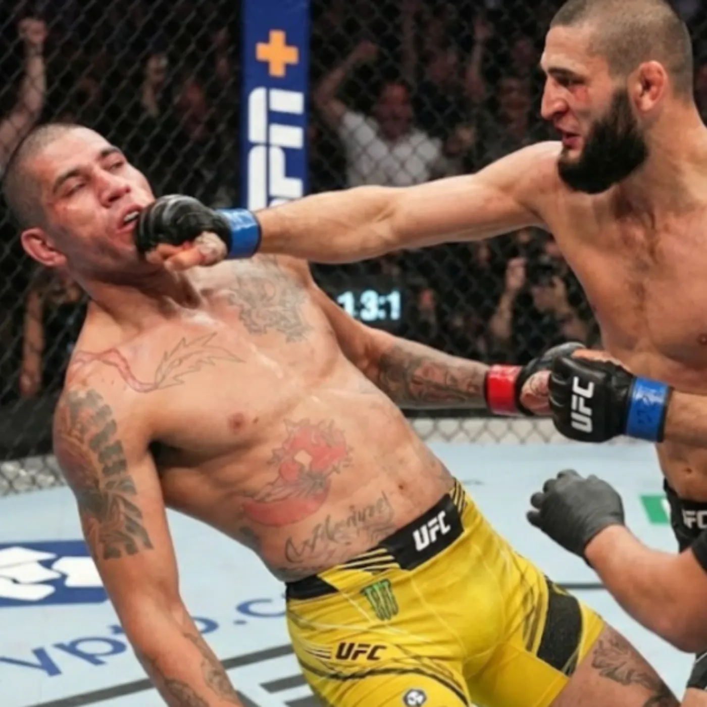 Pereira attempted to plant his feet and fire a jab to measure range, but Chimaev slipped inside the line of attack. The threat of a takedown loomed immediately. Pereira’s hands dipped ever so slightly, mindful of defending against a level change. In that split second, Chimaev shifted gears.