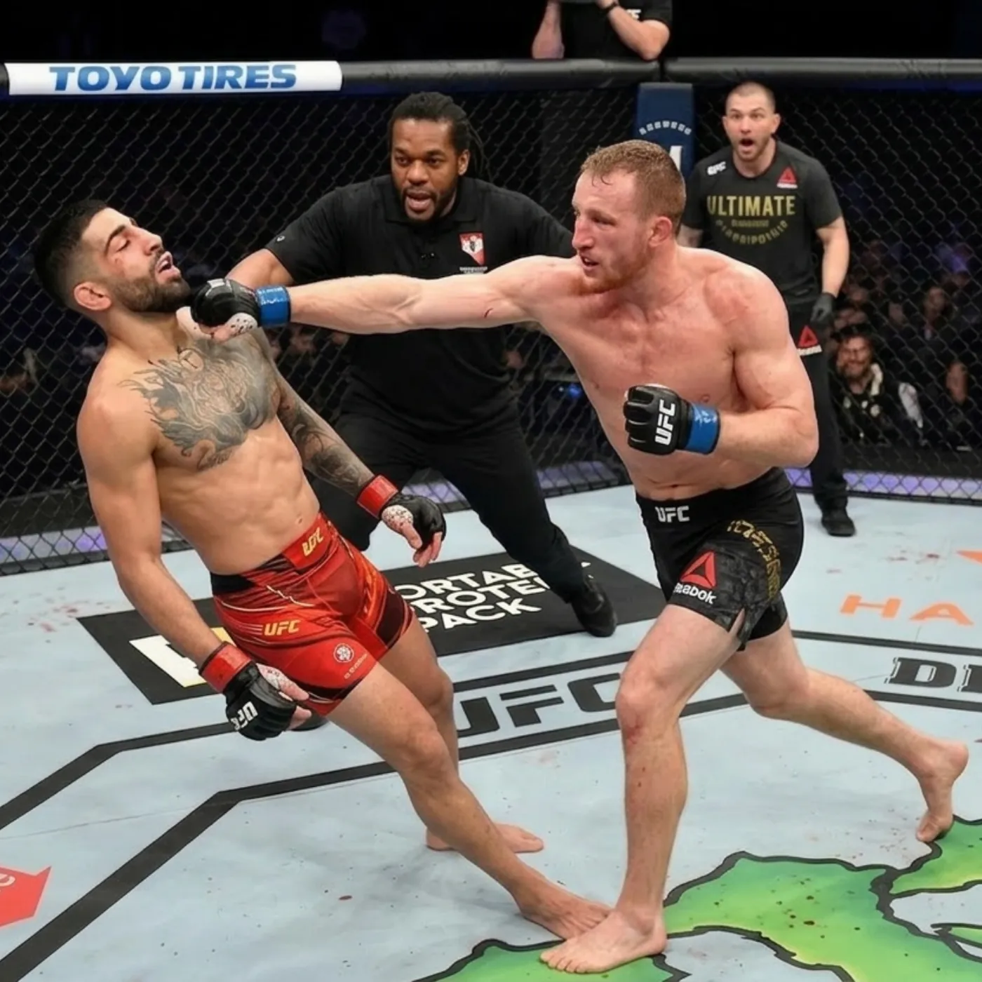 As Topuria shifted his weight, Gaethje stepped in with perfect timing. The right hand came first, sharp and direct, cutting through the space between them with frightening speed. It landed clean, snapping Topuria’s head back and halting his movement instantly.