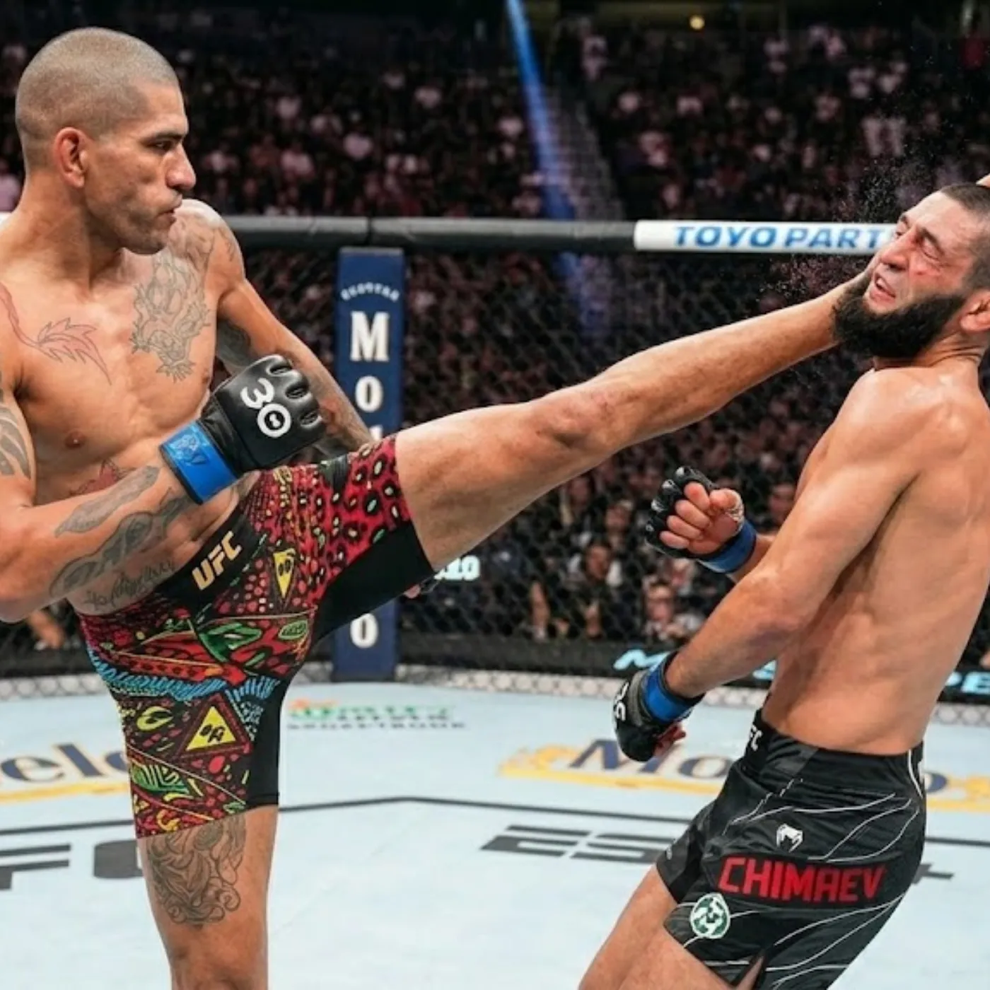 Alex Pereira maintained his signature composure. His posture was upright, his eyes locked, his movements economical. Khamzat Chimaev circled with intensity, looking for the opening that would allow him to close distance and initiate his grappling attack.