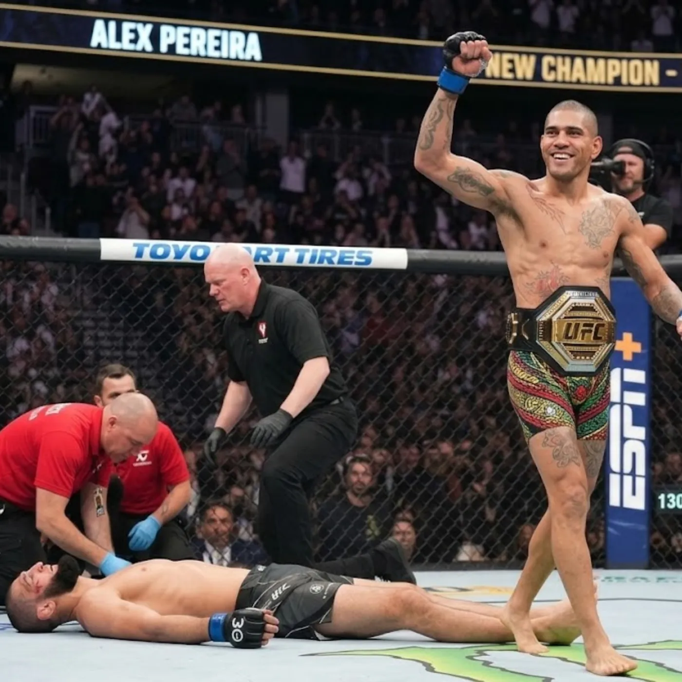 The referee stepped in as Chimaev collapsed under the pressure. The crowd erupted, not just in excitement but in disbelief. Pereira had done exactly what he said he would do.